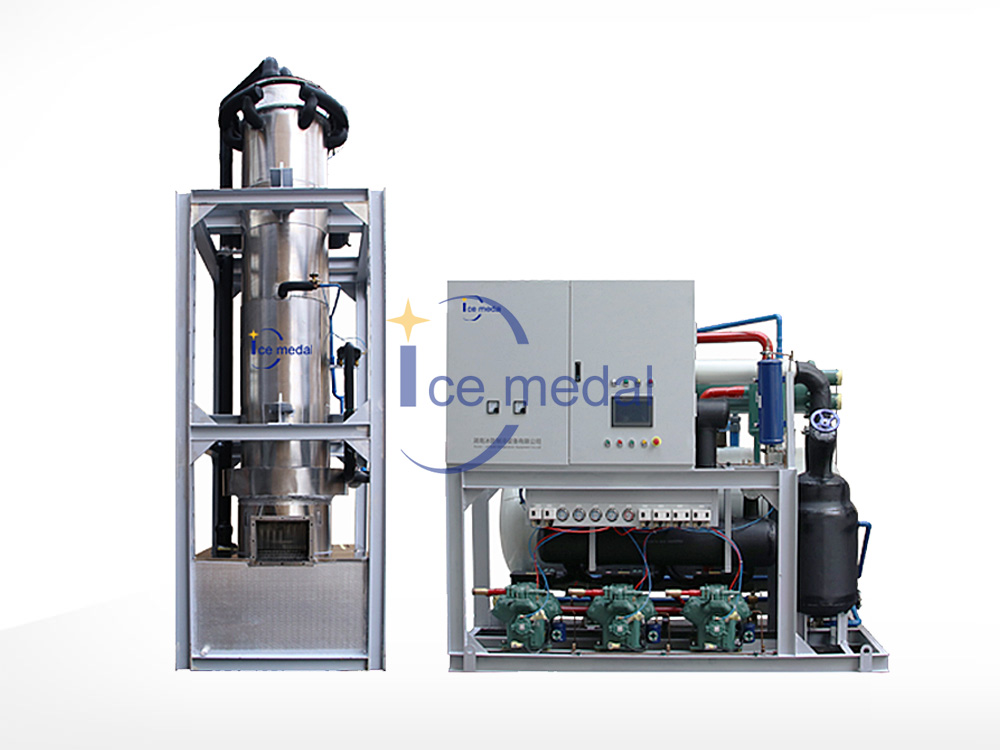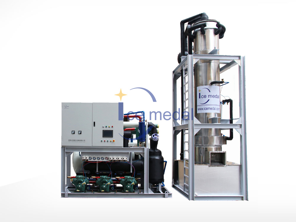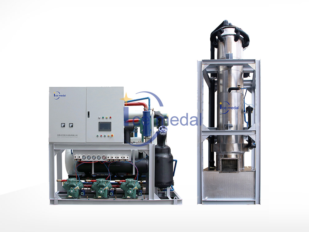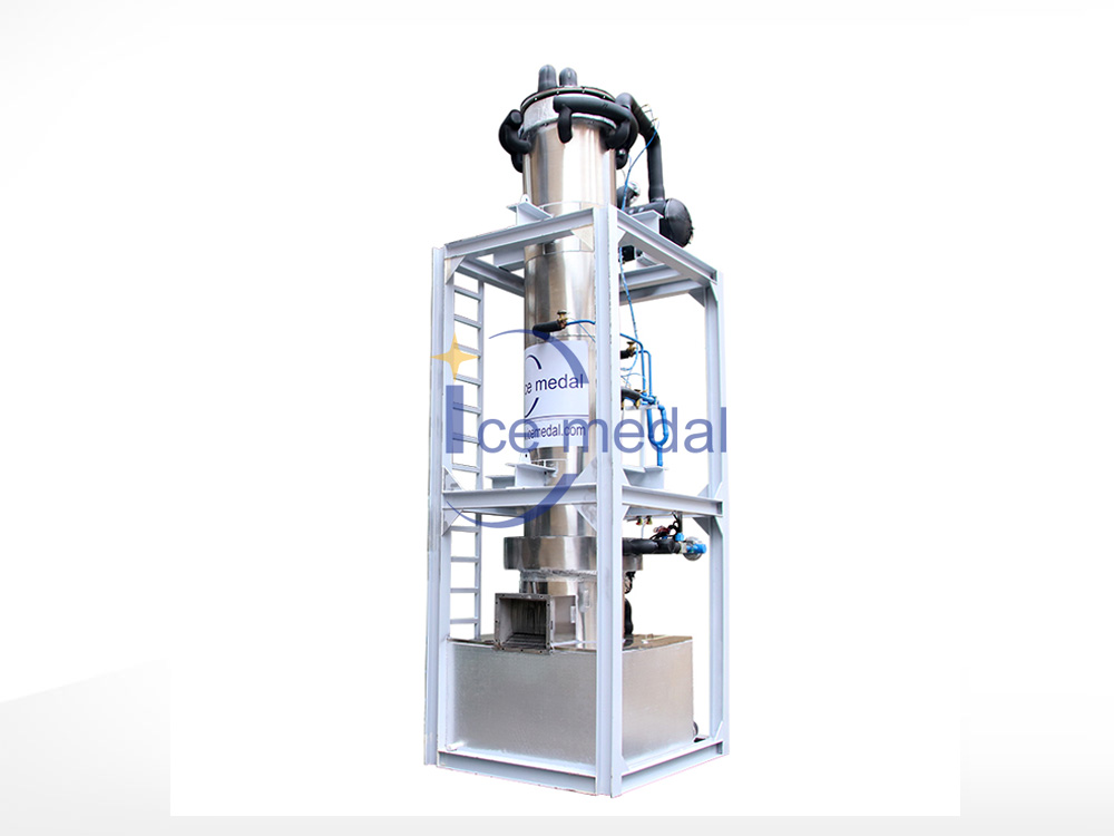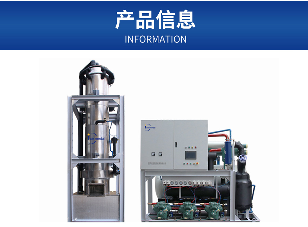 2、管冰机所有与制冰水接触部分材质均是食用级材料。 由多根不锈钢管组成蒸发器制冷剂在管与管之间流动,水在管内从上往下在分水器的作用下呈螺旋状流动, 水在流动过程中形成冰。
