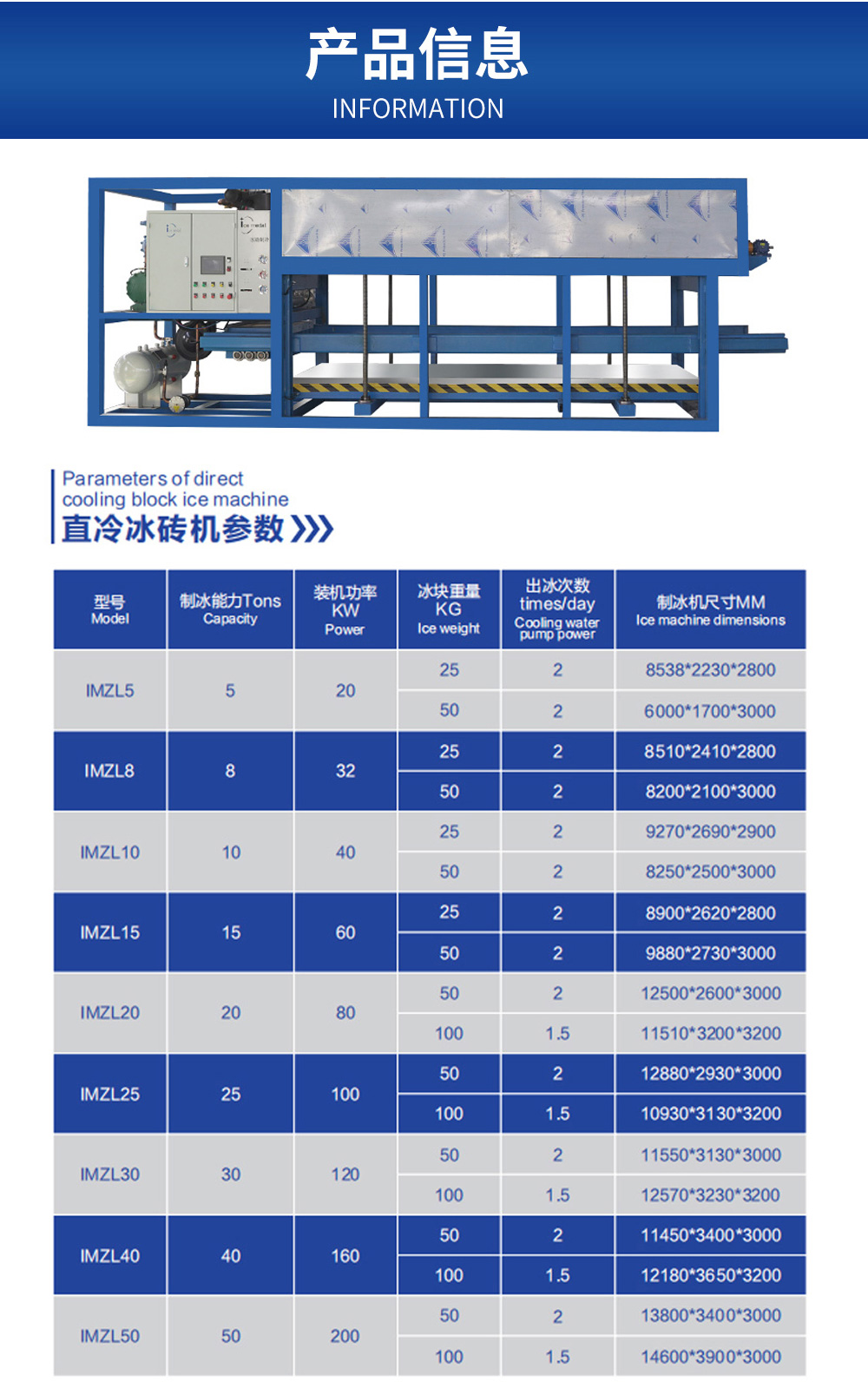 直冷冰砖机是一款冰砖(冰块)生产设备,直冷冰砖机蒸发器采用导热的铝合金材质,与制冷剂直接换热,冻结温度低, 制冰速度快,且冰块融化速度慢。直冷冰砖机自动化程度高,自动制冰、自动补水、自动脱冰,全自动化,无需人工操作。直冷冰砖机冰块干净卫生,可达到食用标准。直冷冰砖机冰模长期使用无需更换,产品模块化设计,操作简单,占地面积小,安装方便,现场接水接电即可制冰。