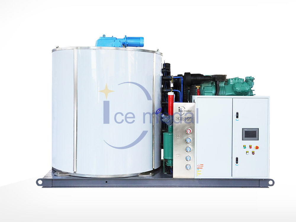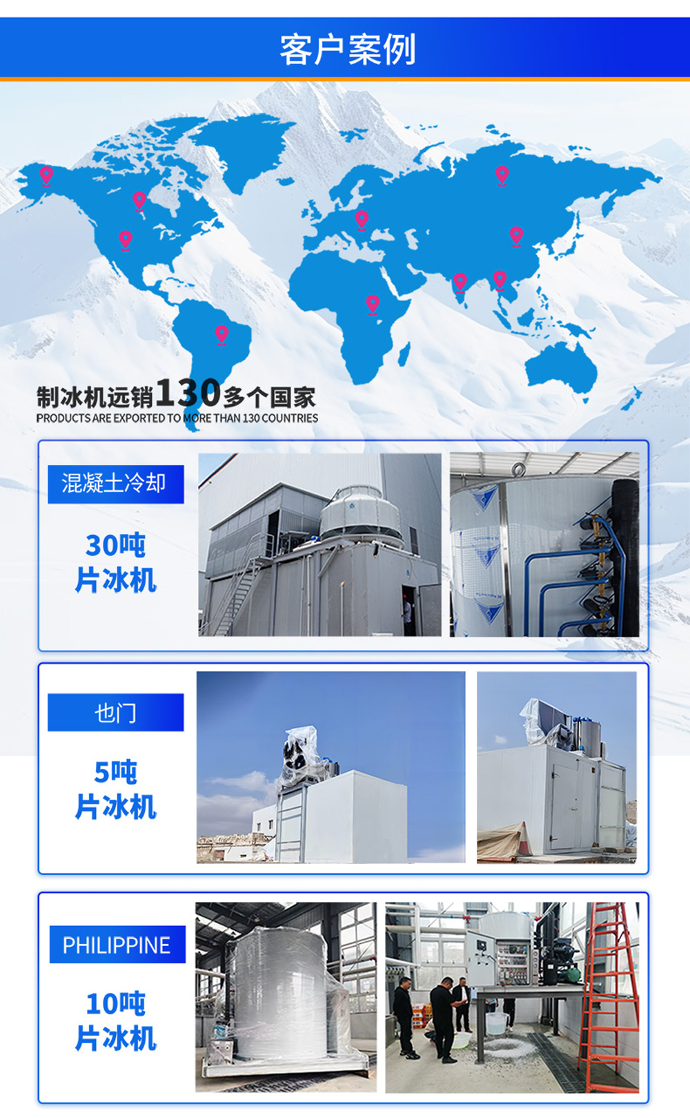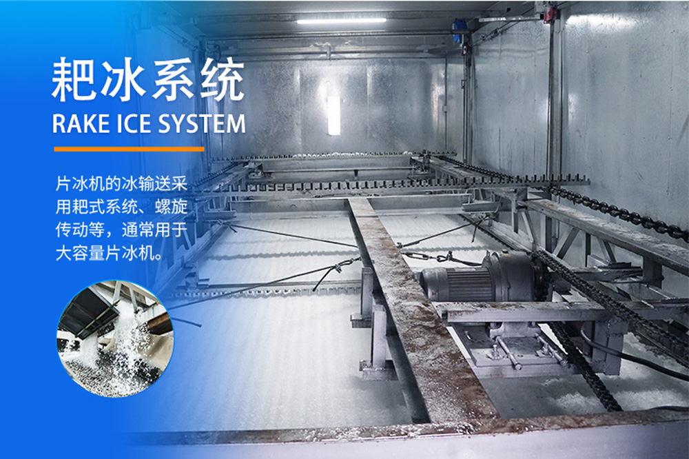 30吨24小时片冰机广泛应用于海港鱼类冷却、混凝土加冰降温等。片冰机采用立式螺旋切冰蒸发器。制冰时水要均匀,通过分水装置分布到冰桶内壁。该系统由集装箱式片冰机、带耙系统的冷库组成。
